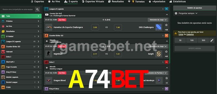 O A74Bet oferece uma grande seleção de opções de apostas em e-sports com probabilidades competitivas